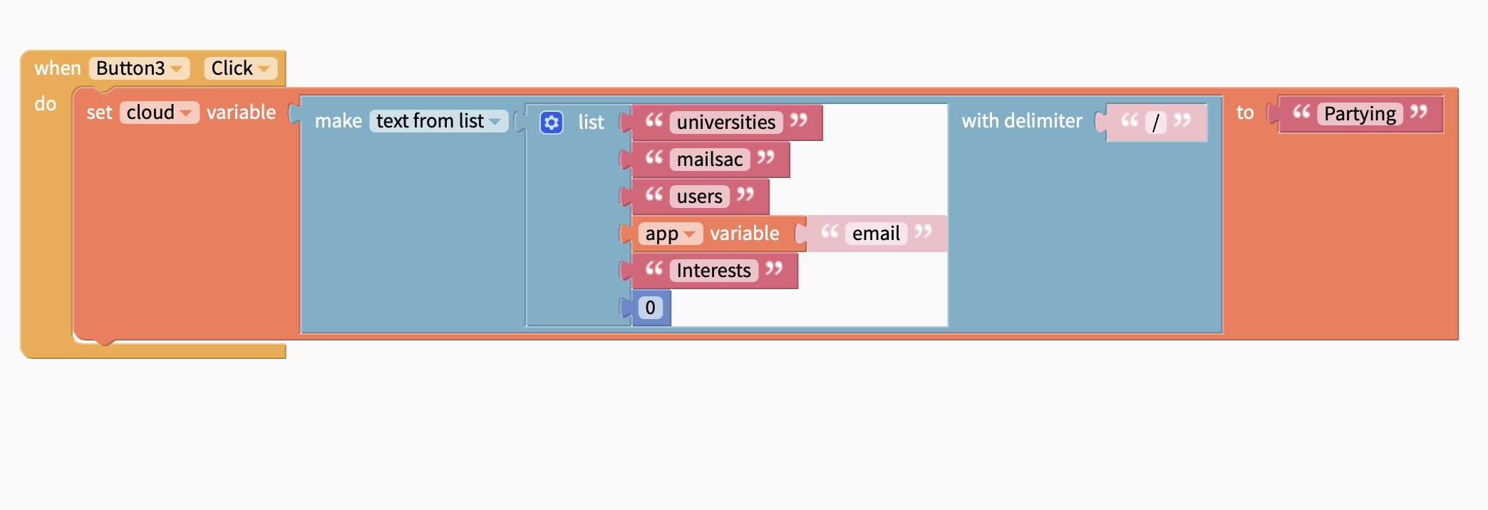 I have created a new user during the app session, with a key email. I also created an app variable ‘email’. Now, in the next step, I want to allocate a particular interest to that particular user. As you can see, the object is: universities/mailsac/users. But it should be universities/mailsac/users/app variable ‘email’ to identify the specific user, allowing for interest allocation only to that particular user. There is no block that I can add to do that. Any ideas?